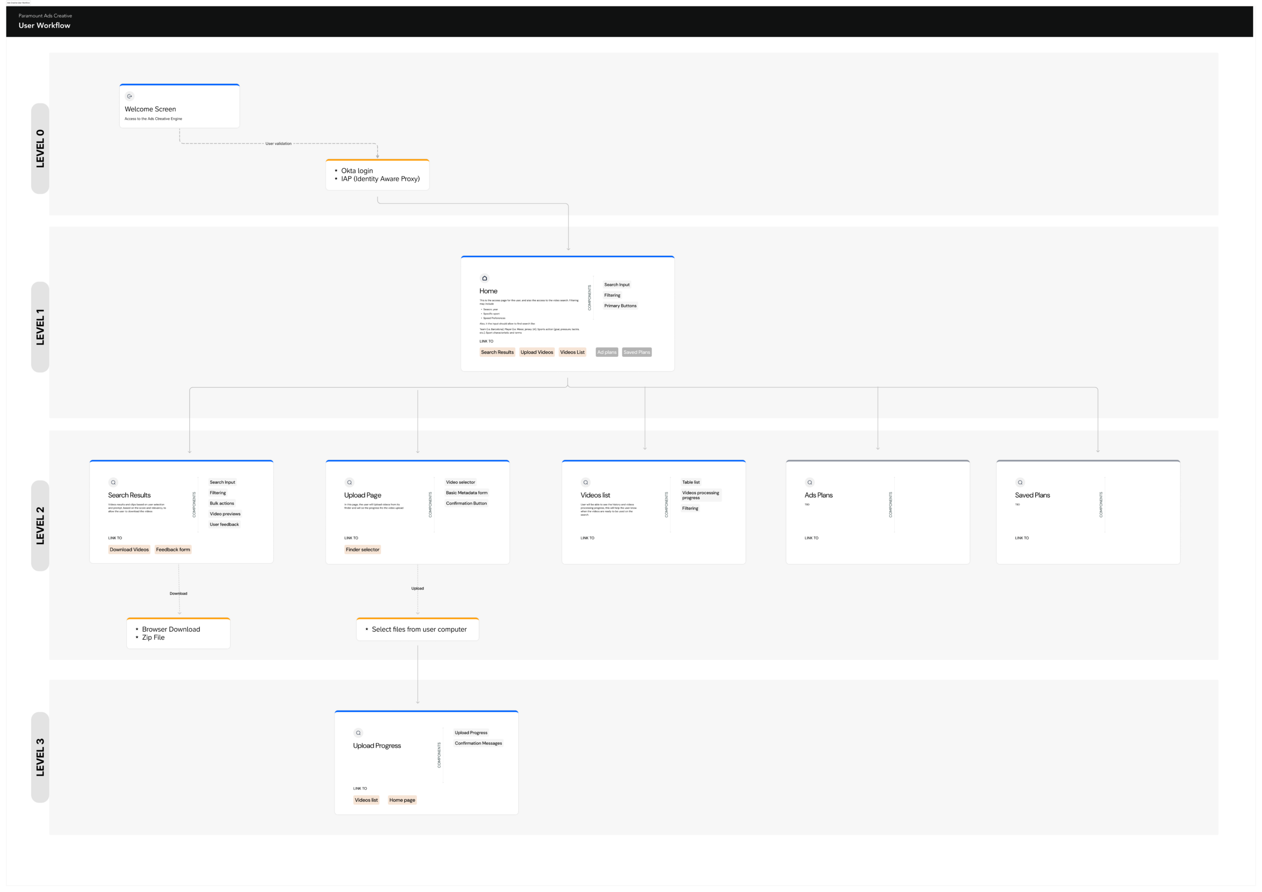 • Multi-Level Workflow: Created a comprehensive user architecture (Level 0 to Level 3) covering everything from Sign-In to Bulk Download and AI Ad Planning.